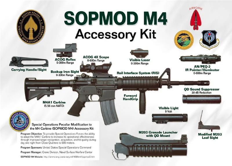 USSOCOM早在1989年9月就在尝试制订一套近战卡宾枪的附件接口标准,并于1992年5月15日正式提出了SOPMOD计划。SOPMOD的意思是“特种作战改进型”(Special Operations Peculiar Modification),这是一套以M4A1步枪为核心的一系列装备的统称。