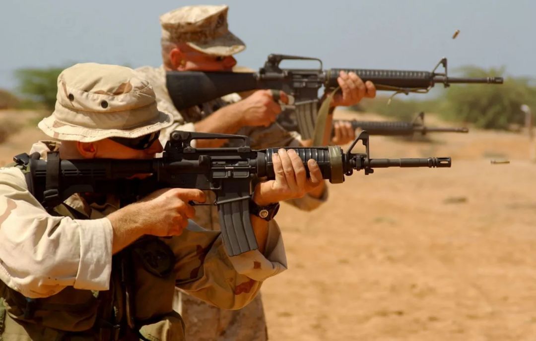 正在使用带提把的平顶机匣M4和M16A2射击的美国海军陆战队队员