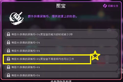 选择聚宝专长,把等级升到3级,就可以解锁聚宝盆功能,如下图: