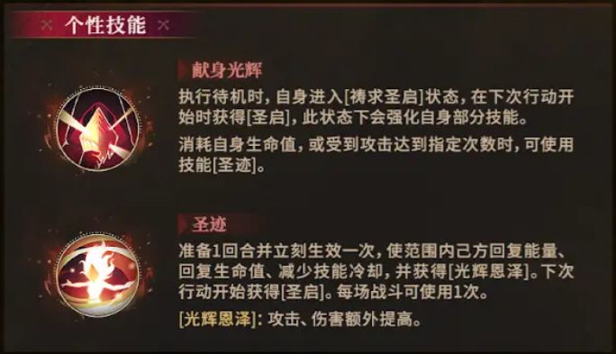 个性技能[圣迹],能够给友军群体回血、回能量并减少技能冷却,以及施加独特增益[光辉恩泽],可立即生效一次,下次行动获得[圣启],每场战斗使用1次。