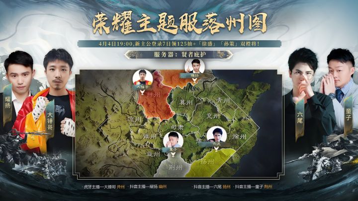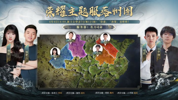 踏青时节,天下三分未竟,忽有烽烟骤起!王者荣耀主播团预谋空降三谋战场!小予神、猪猪小悠、张老三、大锤哥、六尾、耀扬、童子、明凯群雄齐聚,昔日峡谷凭三国英雄绝活纵横驰骋,今朝于沙盘乱世开疆拓土!下面一起了解各服务器落州布局,抢占先机!
