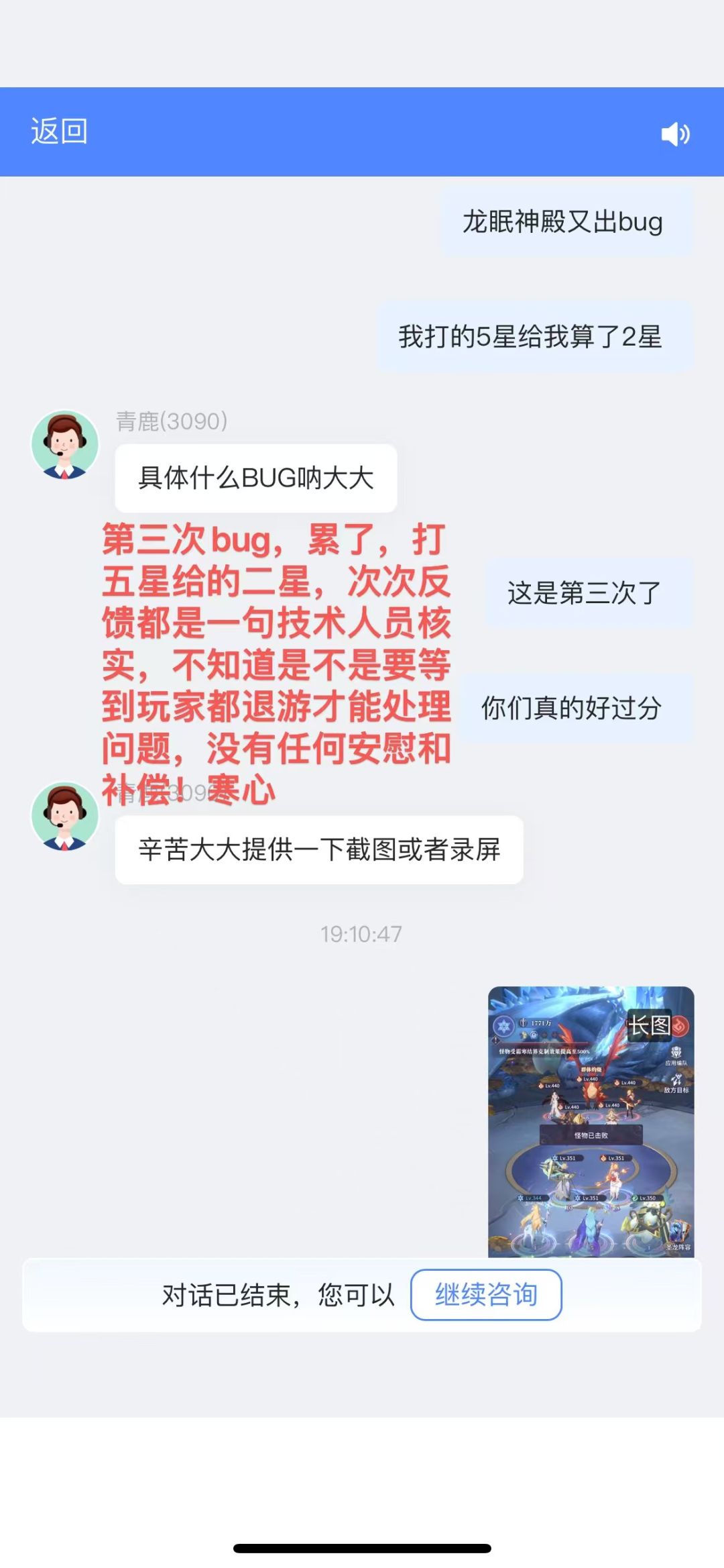 反馈是无效的,等待处理结果是等不到的,出现bug是要自己认栽的,只会让玩家充钱又不办实事的游戏!