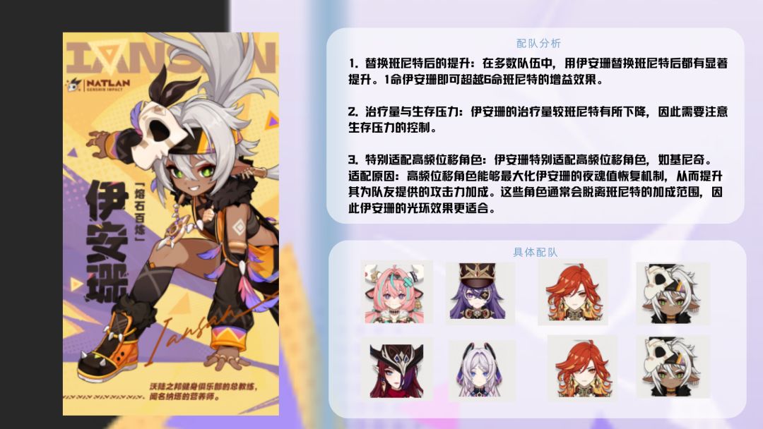 哈喽哈这里是风霜,本期为大家四星角色伊安珊的角色攻略。因为限制3k字,大家看图哦完整版也在图片里面。