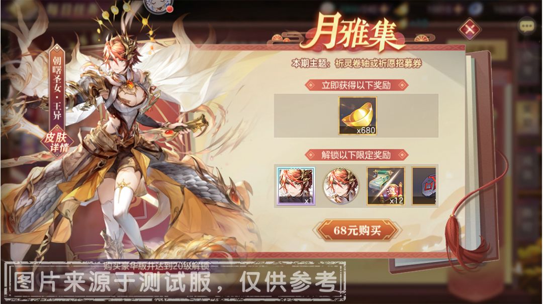 小将军可以通过每个月度完成“每日任务”获取月雅集进度,解锁“月雅集”标准奖励。另外,额外付费68元解锁“月雅集豪华版”后,达成指定等级可获得每月限定史诗级皮肤(本月为朝曙圣女·王异)、主题奖励(本月为祈灵祈愿任选包)等资源,助力小将军闪耀三国! 同时,本期月雅集皮肤返场分别为雨生百谷·诸葛亮、鸠羽风诛·高顺、楼兰公主·辛宪英!