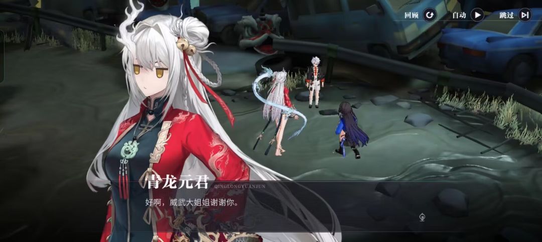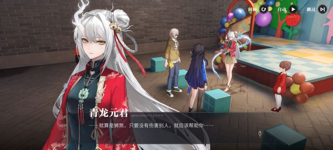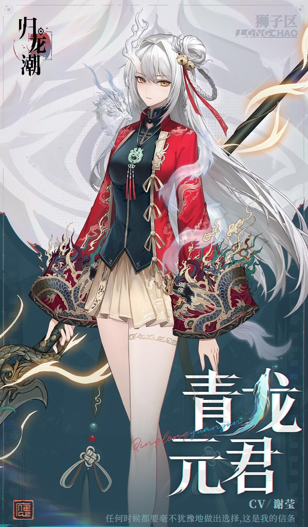 青龙元君这个角色形象设计的不错,颜值挺高。白色齐腰长发,还有小辫子,头发上一侧系着两个铃铛的那种饰品。脖子上戴着玉坠,服装上一些神兽图腾彰显着满满的国服元素。
