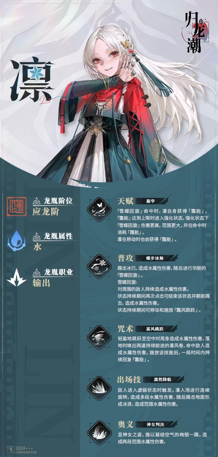 近战水属性输出,冲击技能可以造成持续伤害,咒术可以双向范围攻击,归龙技可以高爆发伤害,输出主C,生存能力偏低,有一定上手操作难度。