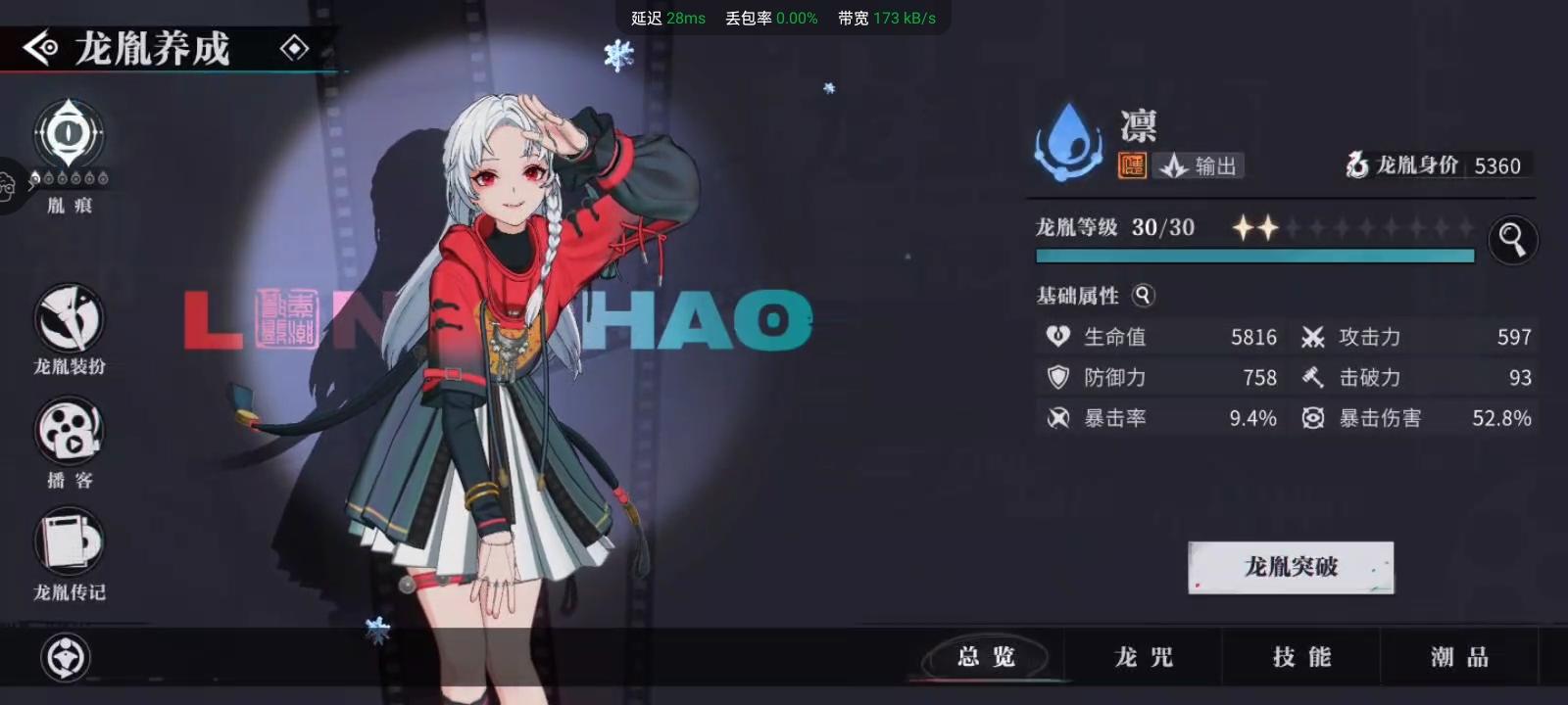 在攻击方面是三测所有人物中仅次于烛的存在(仅仅低2点),但是相应在生命与防御数值方面要高出不少。总而言之,凛是新手期间最适合充当主C角色之一。