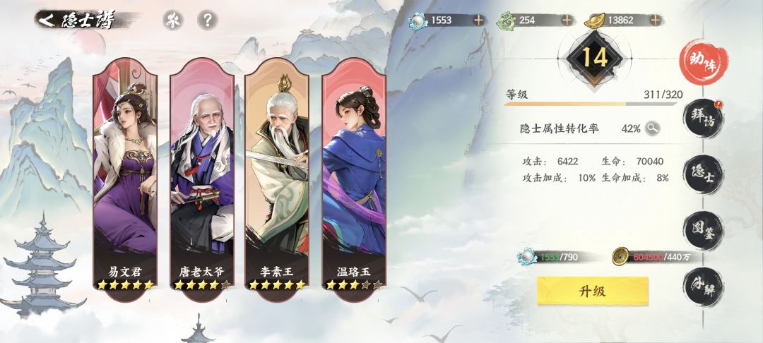 隐士:5⭐易+3⭐起唐老爷+3⭐起温+素老头/明帝,顺序号一般为易1号,唐2号,素3号,温4号或者素1号,易2号,唐3号,温最后
