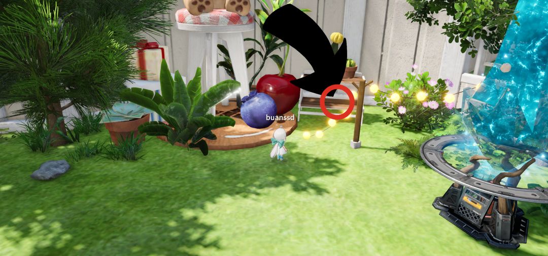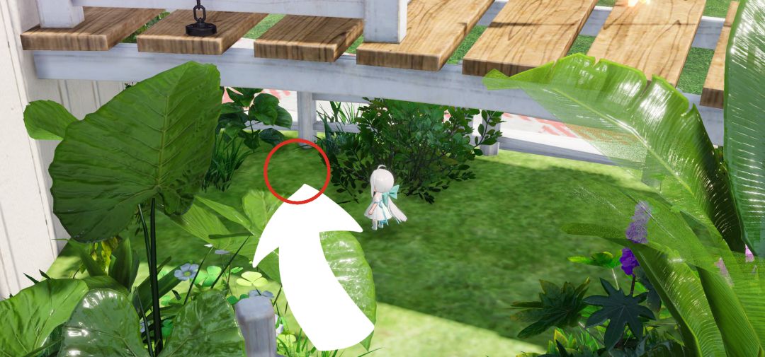 进入地图后,激活区域装置,走出白色栅栏门后向右走。走到到一个大花架底下后,先跳上第一层,再跳上第一层的小架子上,再从小架子跳上牌子下挂着的灯上,再从灯跳到花架的顶层就能看到了