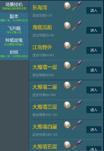 - 【地图】页面是当前可战斗的创建,【场景挂机】战斗难度最下,产出少量灵石和经验,每场战斗必定获得当前转生级别的装备,和场景怪物的灵兽碎片。【副本】战斗难度中等,产出大量灵石和日常消耗物品,有调整次数限制。【飞升路】战斗难度中等,产出藏宝图和转生必备道具,也是师门任务巡逻的战斗场景。【捉鬼】战斗难度中上,大量产出经验和日常消耗物品,捉鬼层数影响战斗难度,每日签到可以重置捉鬼层数。【封妖】战斗难度偏高,产出灵石和高级道具,有挑战次数限制。