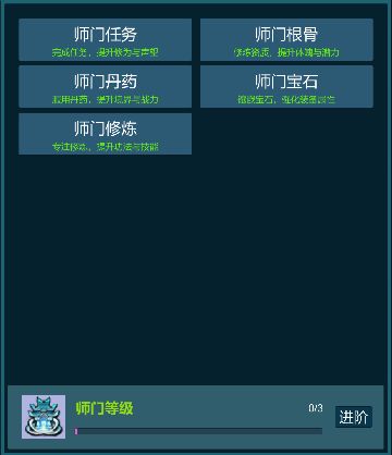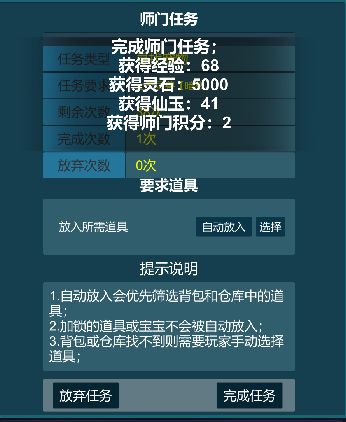 - 【师门任务】师门任务将给与大量经验,大量灵石,大量咸鱼以及海量物品奖励,所以师门任务是每日必做任务。