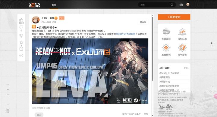 此次联动,亮点十足。联动开启后,《少女前线2》中的莱娅将惊喜“穿越”到《Ready Or Not》中,化身一名英姿飒爽的警员,开启别样的冒险。官方还为玩家准备了福利,只要在发布帖子时添加话题 #ReadyOrNot ,就有机会赢取「Ready Or Not标准版cdk×20」。