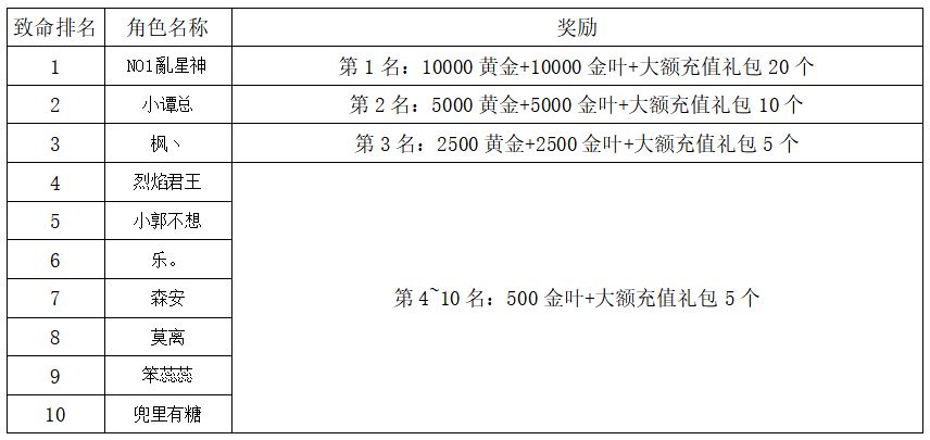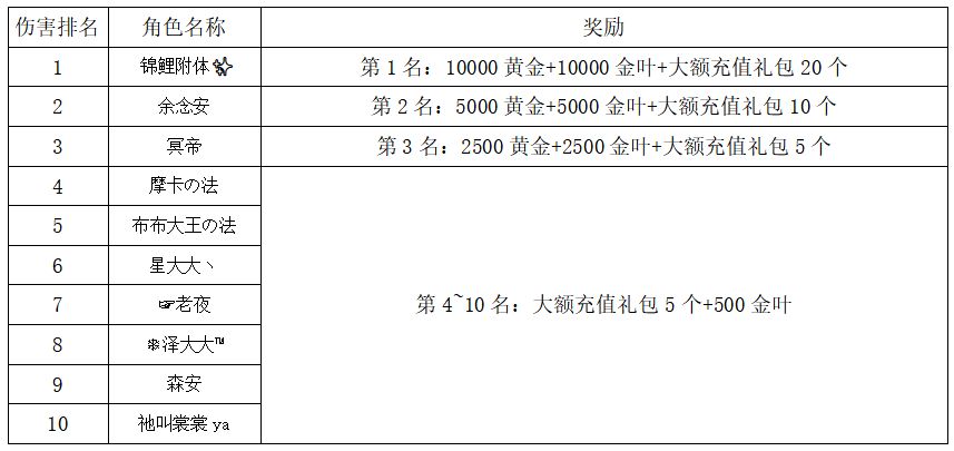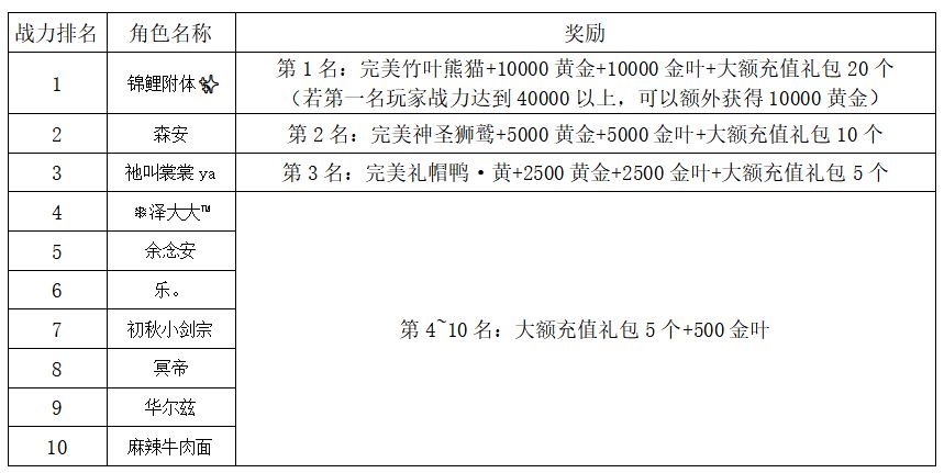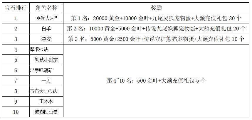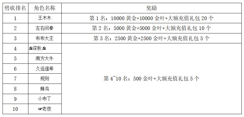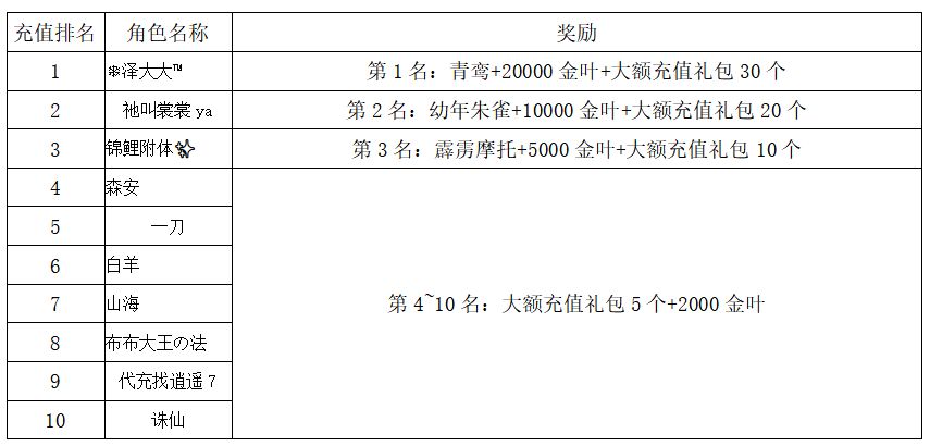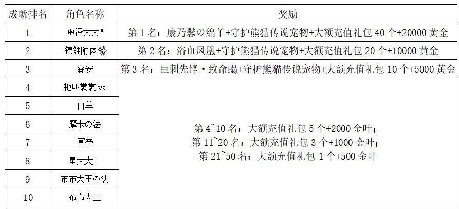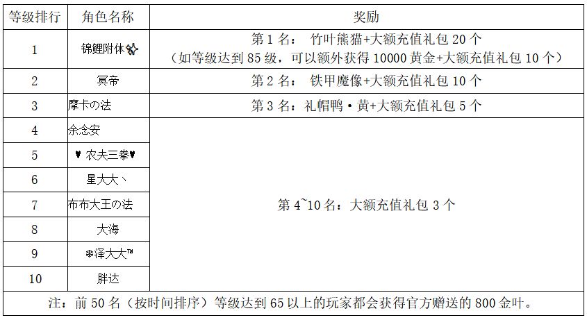 注:以上活动排名均以服务器时间为准。新区排行榜活动如发现存在违反游戏相关规定使用游戏外的辅助工具进行作弊将取消获奖资格。