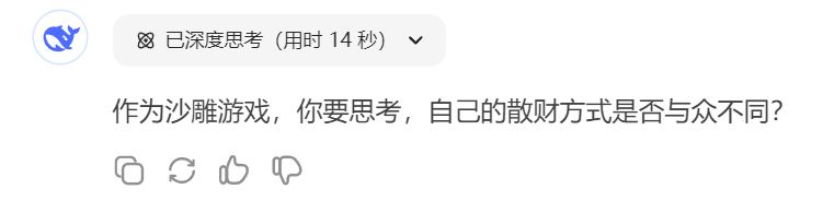 想要散尽家财,是非常简单的事情,毕竟做个真实百亿补贴,就能轻松破产并获得蜗爷们的认可,但这应该并不是大家想要的。果不其然,DeepSeek紧接着补充了一句: