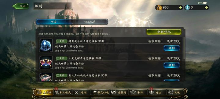 活动期间登录游戏即可领取250包免费卡包。