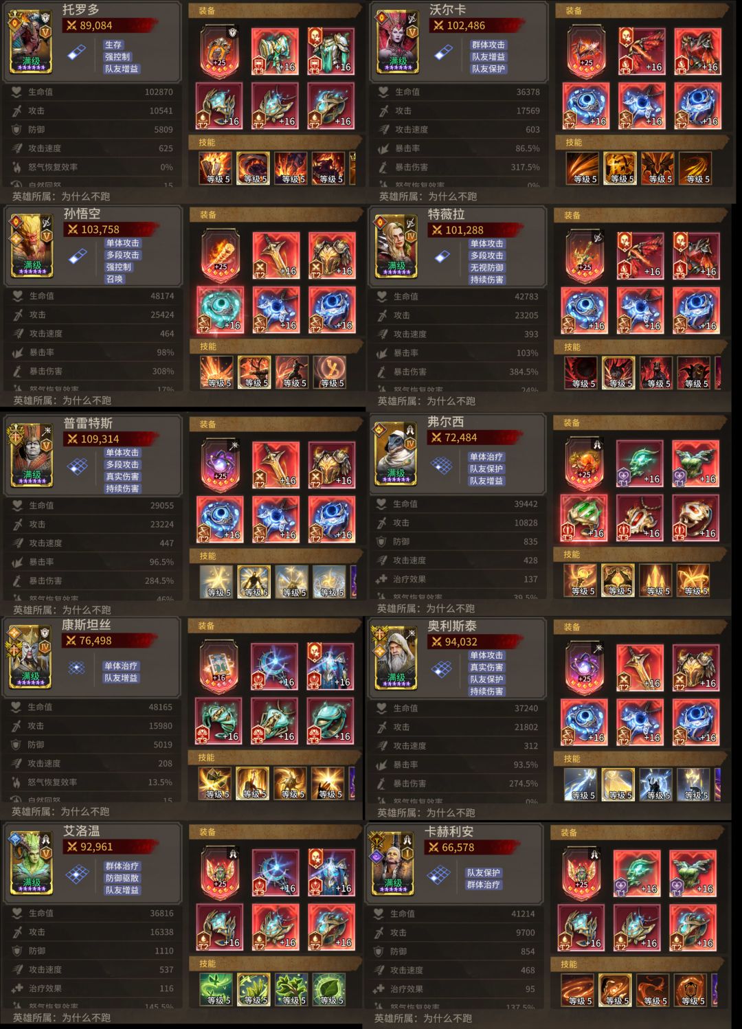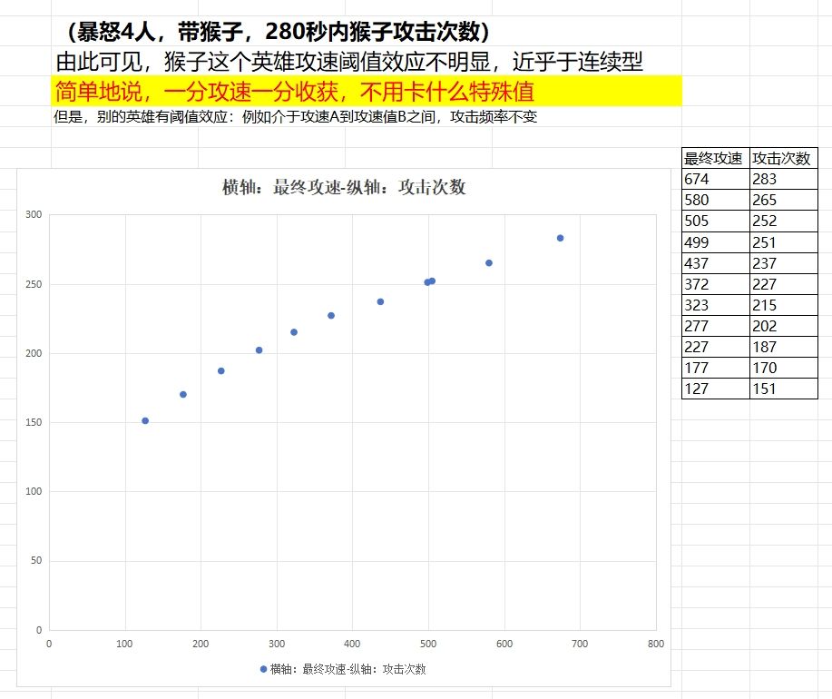 白胖天赋有50%生命,故血量可以适当降低。特别强调,白胖最终攻速(100+万神+装备)一定要大于等于469才可以,因为他的攻击频率-攻速数值曲线是阶梯型的,有阈值,468都不行。不要看游戏里那个攻击间隔数值,那个不准。额外提一嘴,实际测试下来,猴子是连续型的,堆攻速就有收益。