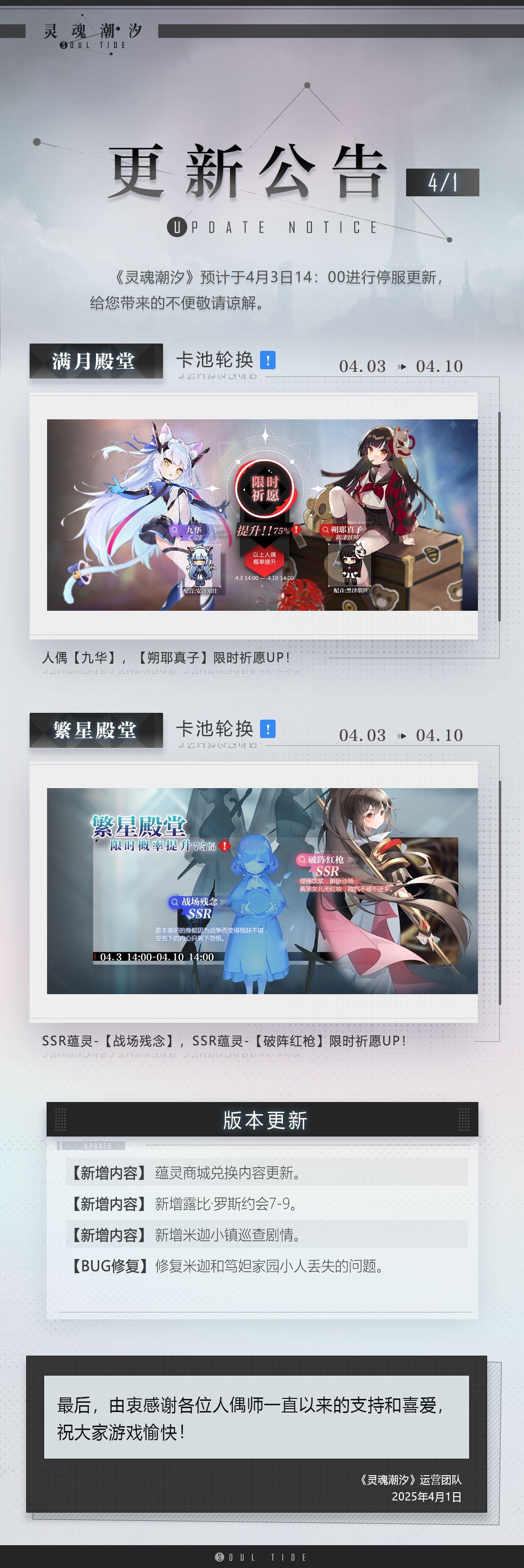 《灵魂潮汐》预计于4月3日14:00——16:00进行停机维护,维护期间将无法登录游戏,给您带来的不便敬请谅解。本次维护预计持续2小时,维护时间可能延长或提前结束,具体时间请以开服时间为准。维护结束后,维护补偿将以邮件的形式发送至您游戏内的邮箱。为避免出现物品损失、进度丢失等异常情况,还请在13:50前完成关卡结算。