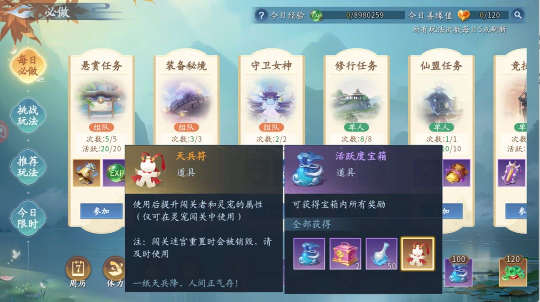 灵宠闯关在每周一的五点会重置进度,开始前可以在宠物选择的界面借用三只好友/盟会的宠物,优先选择高战力的(主战和辅助要都借满)。每天日常活跃度达到一定阶段会给1张天兵符,做满一共五张,每张能加主角+宠物5%的属性(一周最多可以拿35张,175%属性)。如果第一天打不过的话,可以暂时搁置,攒个两三天的天兵符吃满buff再来挑战。