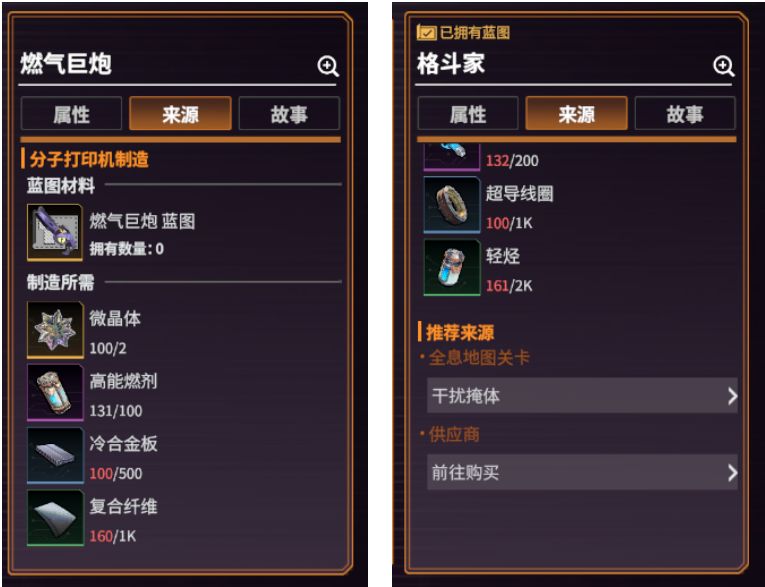 优化了物品详情弹窗,可以更清晰查找来源、制造路径、蓝图和成品库存之间的关联