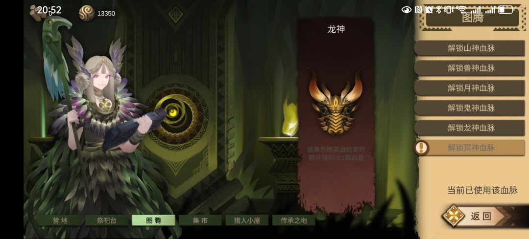建议最实用的青铜第一关开始,过关奖励宝瓶星(图二),然后木头拿去开图腾武神血脉(图三),之后所有过关木头都用在集市上(图四),集市全部开完之后,开始点图腾,点到龙神血脉(土五),之后使用龙神血脉,后面的冥神没啥用,不建议浪费木头,后面所有木头用来开祭祀台(图六),开祭祀台的目的是为了封印无用的装备,三个种族全过完图,把九个装备全封印,木头正好用完,一点不少,也一点不浪费。