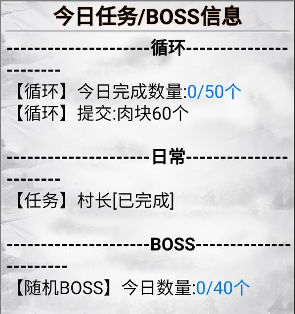 地图上的“!”是boss的所在地,boss分别有蓝、橙、绿、紫色,击败绿色会概率掉落一颗麒麟(可以升级寻怪上下限,直接吃也会提高回复体力百分比),紫色会固定给1颗麒麟。所有会获得大量经验和内丹(提交循环任务材料的一种)前期升级需要去击败。在地图上随机移动也会概率遇见本地图上的每日boss,建议把40个每日boss打完。可以使用连点器快速寻找每日boss。每日boss会出现当前地图的固定boss,建议前期去地图都是绿色boss的地方刷每日boss。20、70、110、130、140、150地图都是绿色boss可以去这几个地图刷