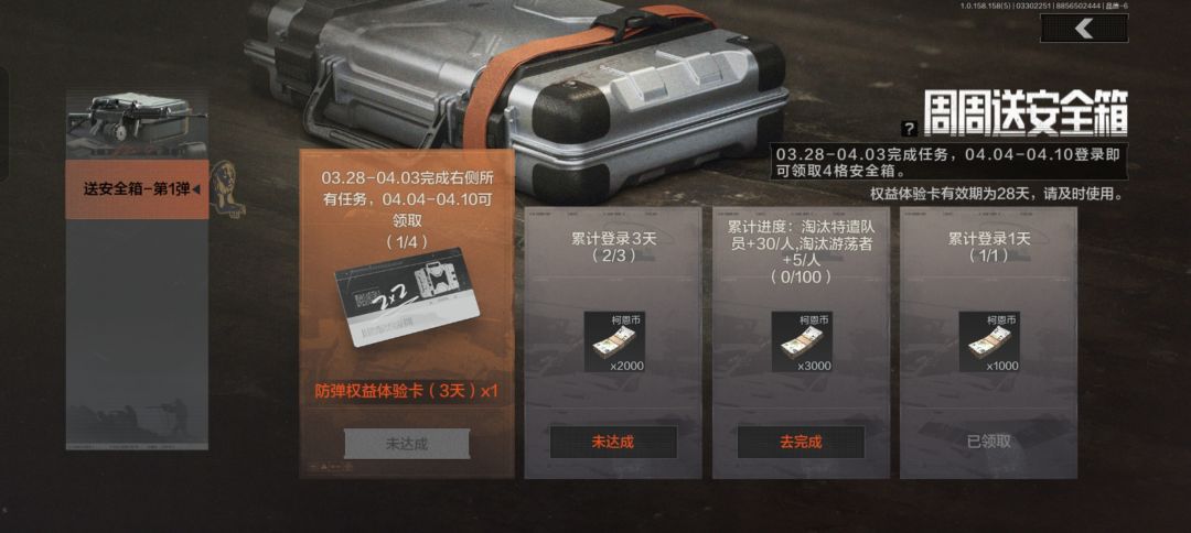 完成每周任务,次周登录可领防弹权益体验卡(3天)。