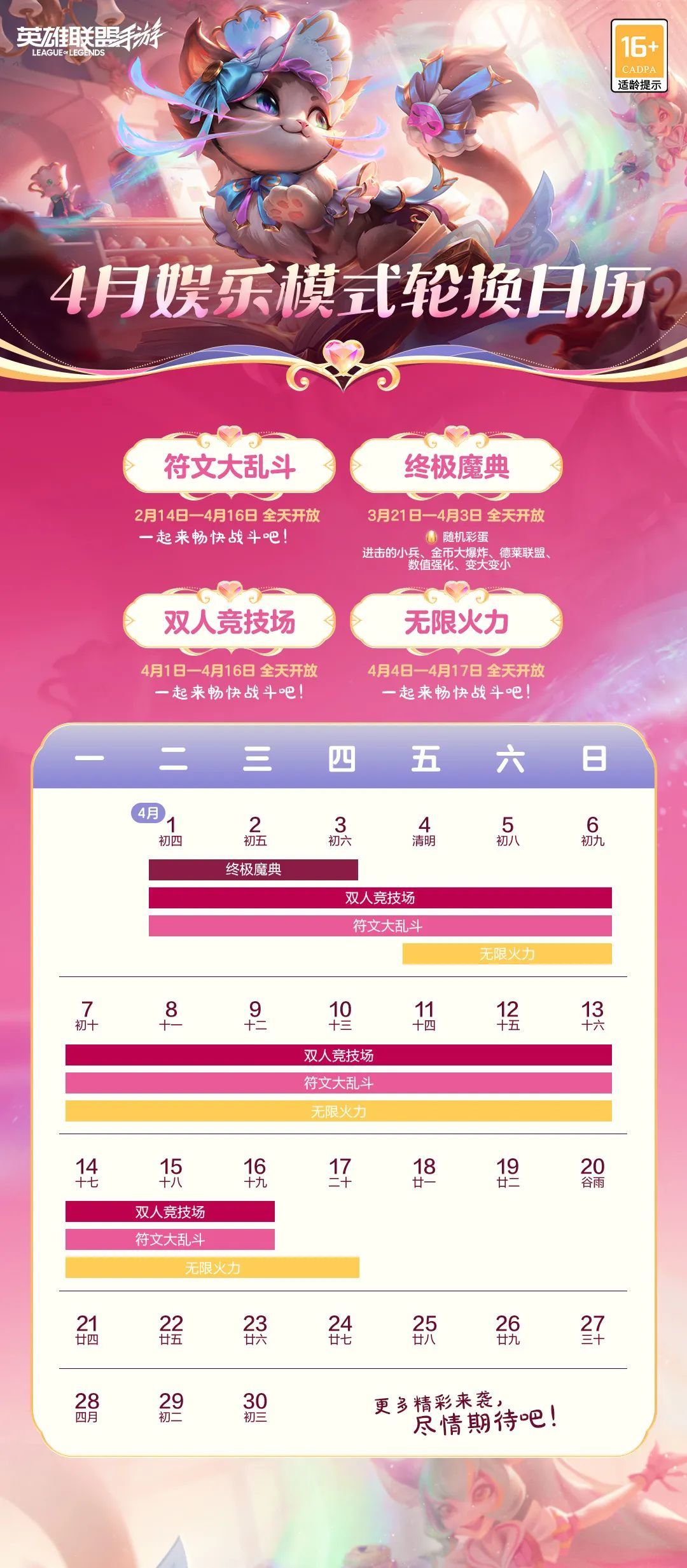 一时娱乐一时爽,一直娱乐一直爽!来者可是4月份娱乐模式轮换日历。双人竞技场已于今日火热开启~更有符文大乱斗、终极魔典、无限火力模式轮番上阵,忍不了了,马上“符”一把!
