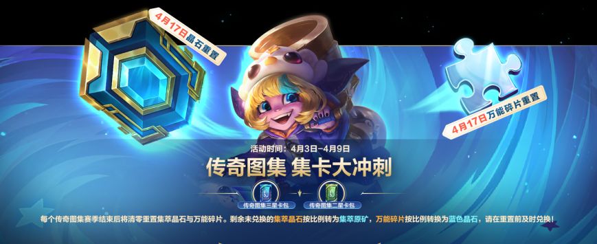 传奇图集集卡大冲刺!4月3日00:00-4月9日23:59活动期间,召唤师参与活动点击前往传奇图集还可领取传奇图集三星卡包(蓝)与传奇图集二星卡包(绿)奖励~