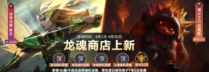 4月龙魂商店轮换上新!召唤师可用龙魂水晶*3500兑换末世天使 凯尔和龙魂水晶*4500兑换熔火之心 拉莫斯,同时还有新一轮的橙色原石*50可供兑换噢~