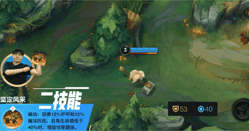 被动:获得12%的双抗加成,自身生命值低于40%时增益效果翻倍。