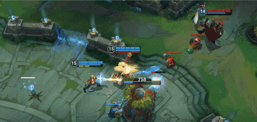 对线期可以在有被动技能时开启W(2)技能,利用加速效果将对手E(3)技能推墙,眩晕的同时打出Q(1)技能的两段伤害,最后补普攻触发被动护盾,完成一波完美换血。
