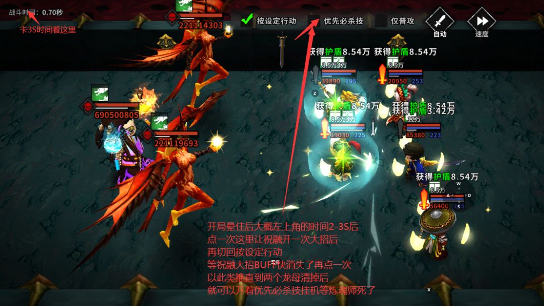 首先两个晕魂是必备的,不然BOSS会先手秒你。利用两个晕魂晕三个后,筒子就接大招打后续的控制,由于BOSS半血以后会霸体(不再吃控制,不过打出半血的那一次伤害附带眩晕的话,是还可以继续晕住霸体一段时间的),并且龙母第二次出手会开魅惑控住我方,所以我们这个套盾乌龟流需要在龙母半血到第二次出手开魅惑的时间内击杀龙母,也就是说我们要在这段时间尽可能打更多的输出,所以在龙母的减伤BUFF消失后打出半血霸体是最优解(伤害够的可以无视这个小技巧,伤害不够就卡3S再打出半血霸体)