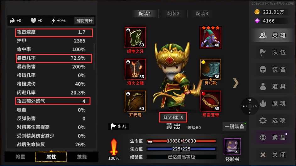 攻速1.2+45%以上兔子魂(开局比黄忠先手即可),攻怒4以上(没有攻怒的话,大招会续不上)