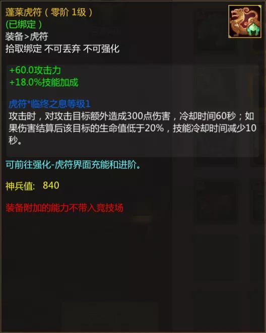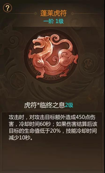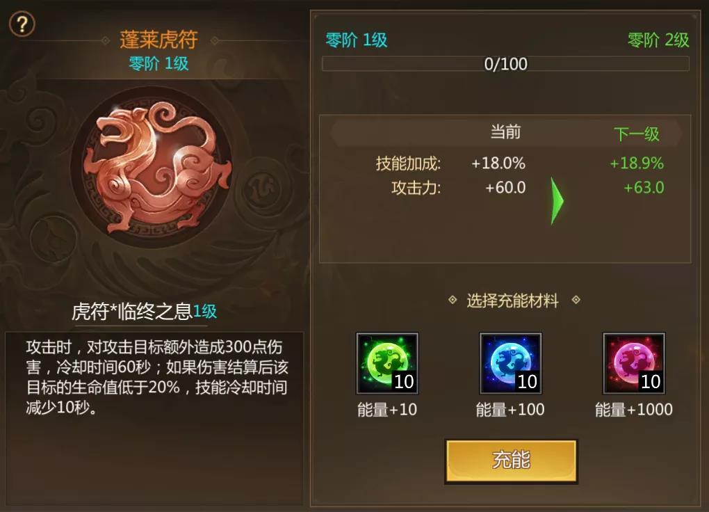 本次上线共有两款虎符,分别是蓬莱虎符和元神虎符,两个虎符都能为大家带来60点攻击力加成和18%的技能加成,同时两个虎符又分别自带一个对应的技能。