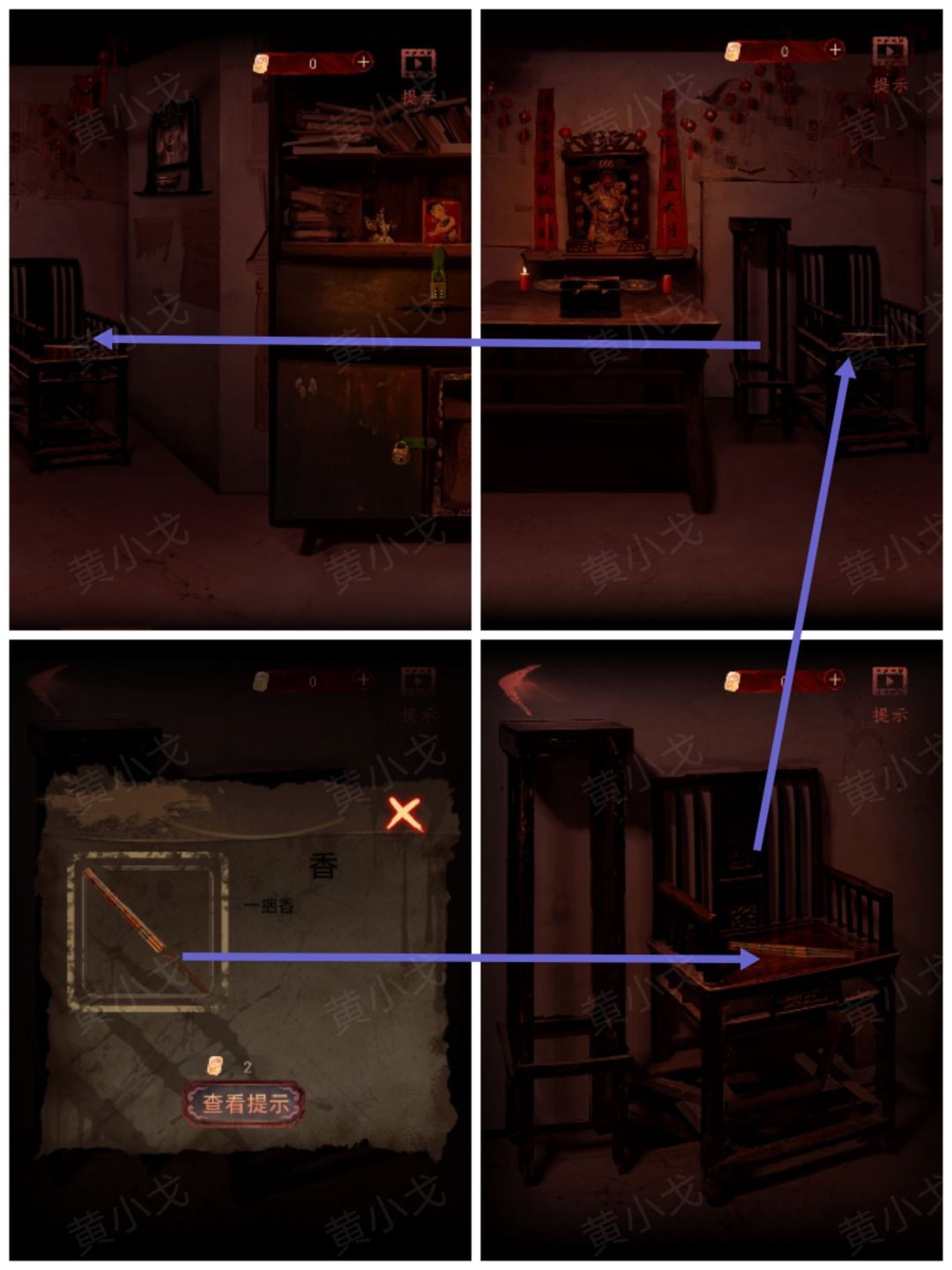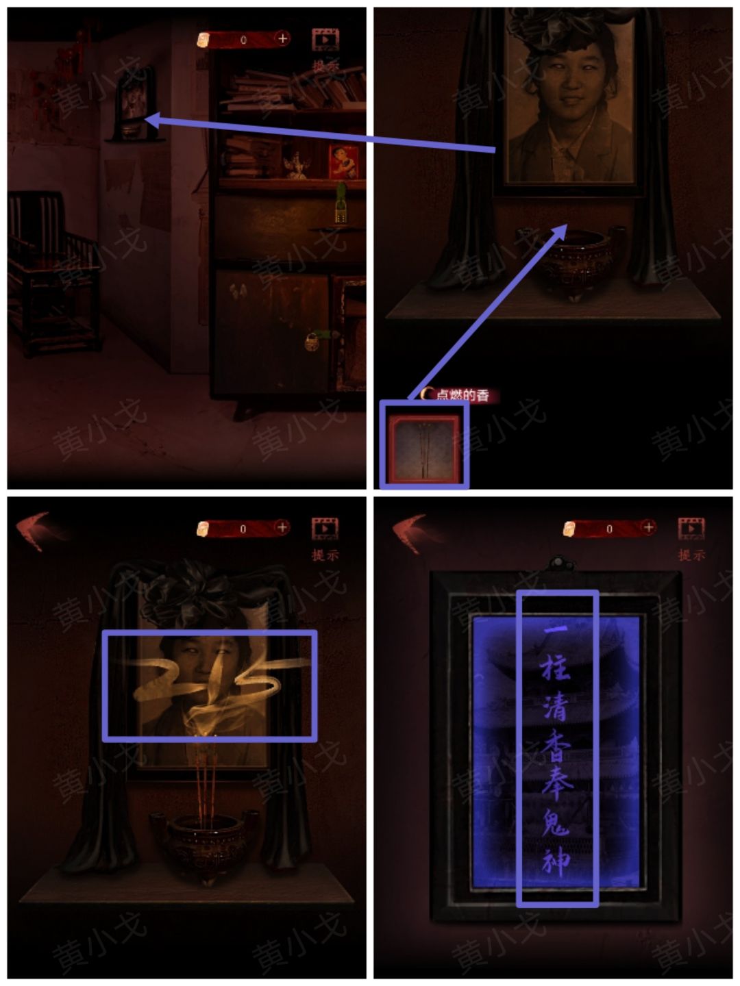 28.点击墙上的遗照,根据照片上的线索,把【点燃的香】插入香炉,获得线索