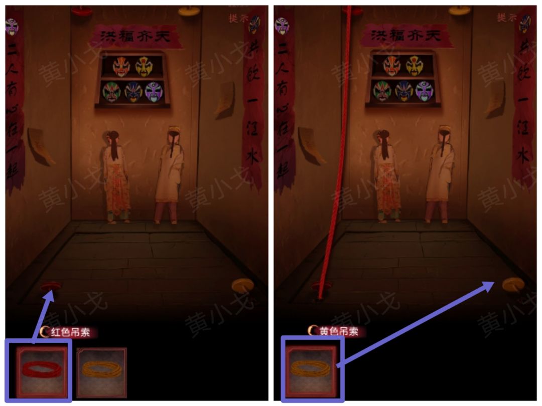 10.给地上的红色绳扣绑上【红色吊索】;黄色绳扣绑上【黄色吊索】,触发剧情