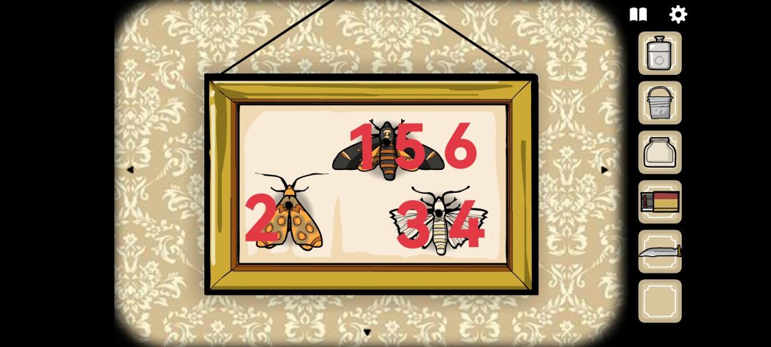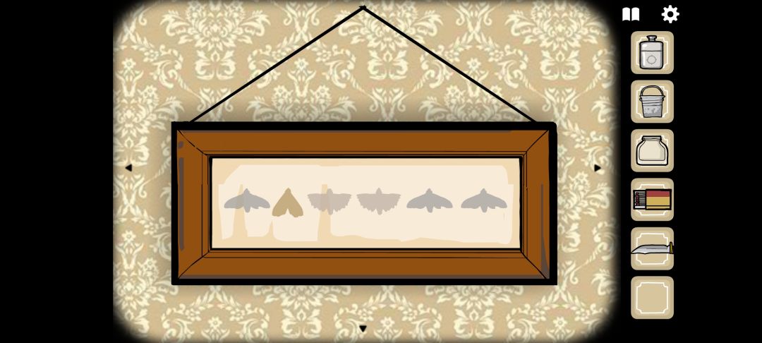 ◆回退场景后右滑两次,到达有门的场景,点击左侧的蝴蝶标本,把[蝴蝶]放在空缺的部分,开始解谜(按从小到大的顺序依次点击蝴蝶,共六次):