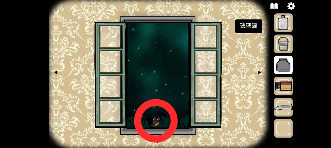 ◆回退场景后,用[玻璃罐]捕捉右窗的蝴蝶,拾取[蝴蝶]。