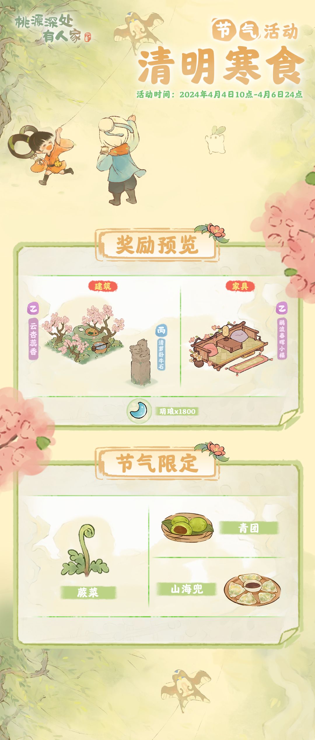 活动期间山民们在可以种植节气农作物「蕨菜」,用来制作美味的节气菜品「青团」和「山海兜」。 萝萝山已准备好了本期的节气限定建筑和家具,山民记得参与活动获取玥琅,不要错过兑换时间萝!