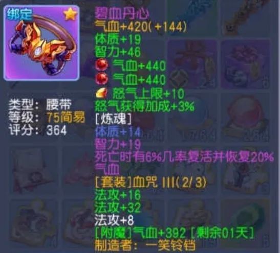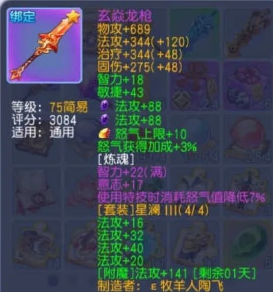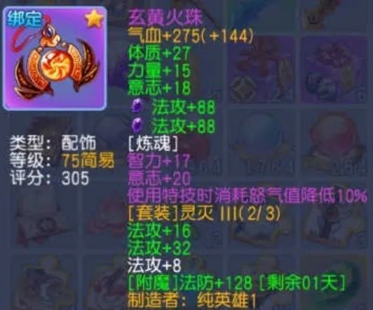 炼魂属性:炼魂属性方面智力加17,意志加20,属性表现尚可,但仍有提升空间。特效是愤怒降低10%,这一特效表现相当不错。建议使用超级石锁定特效后,尝试洗炼一下属性,以进一步优化。