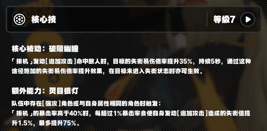 ●队伍存在[强攻]、同属性角色时,基于「扳机」的暴击率提升自身[追加攻击]的失衡值倍率,即吃满暴击阈值为90%,在协助零号·安比时,还能对「扳机」提供[追加攻击]的暴伤增益,形成增益闭环,完善自身后台追击的输出能力;