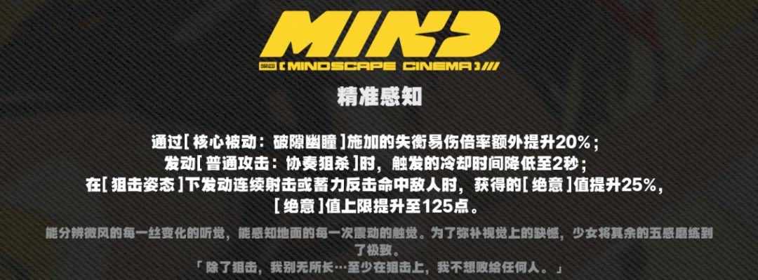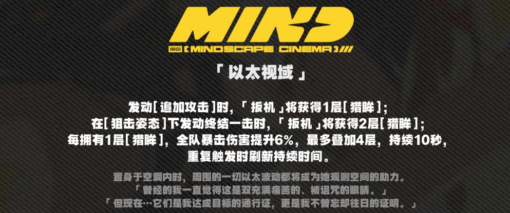 ●发动[追加攻击]时获得1层[猎眸],[狙击姿态]的终结一击获得2层[猎眸],每层为全队提供6%暴伤加成,上限为4层,持续10秒;