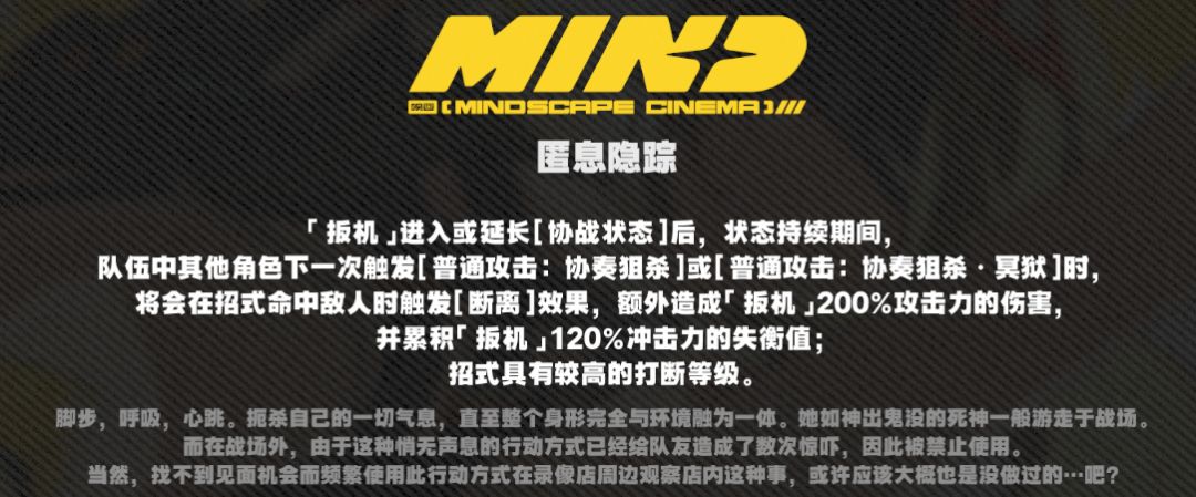 ●拥有[决意]值期间,队伍中其他操作中的角色发动[强化特殊技]、[支援突击]、[终结技]重击命中敌人时会触发[协奏狙杀·冥狱],即「扳机」的强化型[追加攻击];