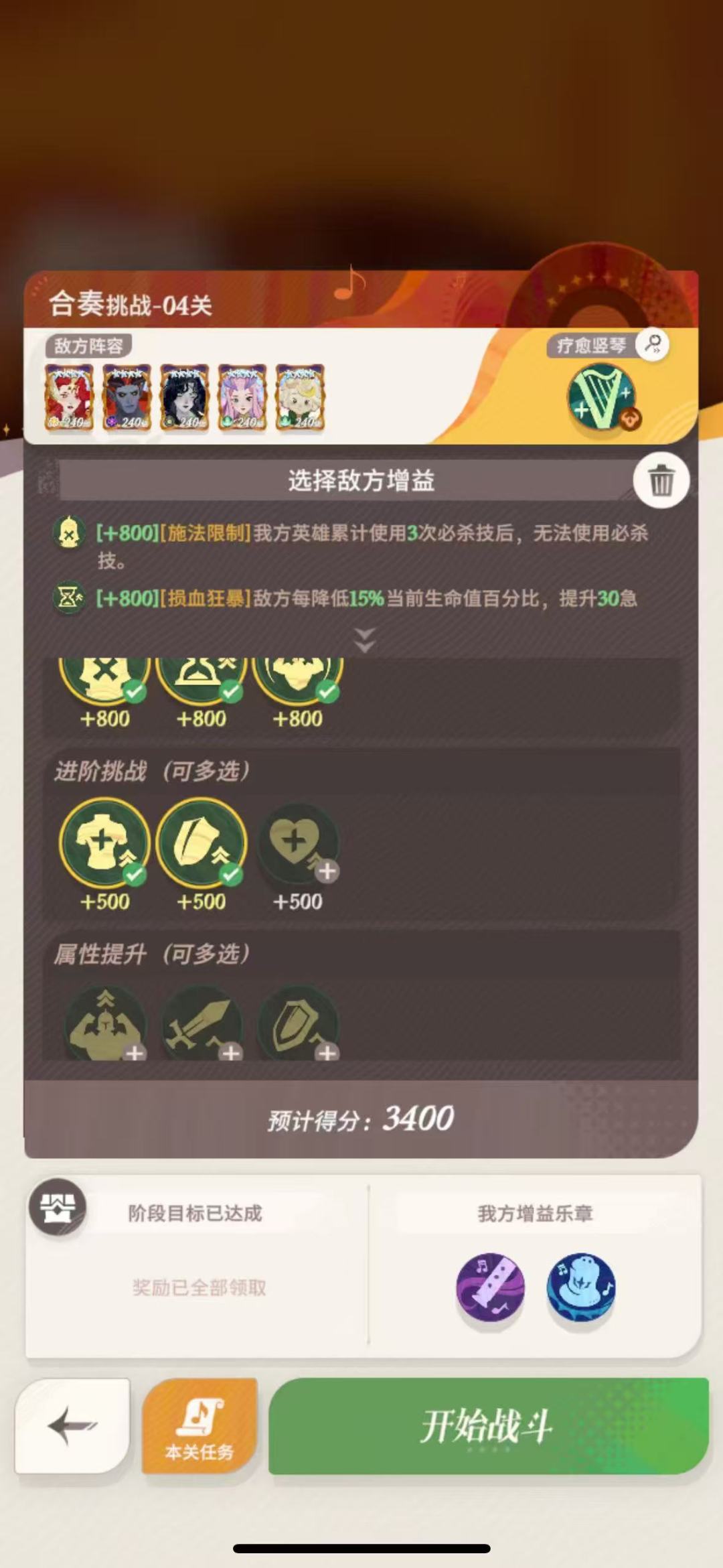 今日的3200分的阵容,我们勾选机制挑战的全部绝对进阶挑战的1和2,属性提升不要选择,后排会被直接秒杀这样是3400分,我方乐章选沉醉之笛和震撼钟鸣。