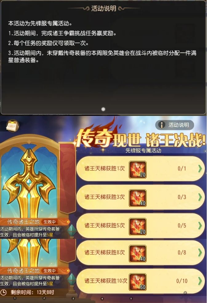 (3)活动期间,诸王争霸玩法内会具有特殊场地效果——传奇诸王之地:英雄所穿的传奇装备在玩法内生效,且会被临时提升至5星。