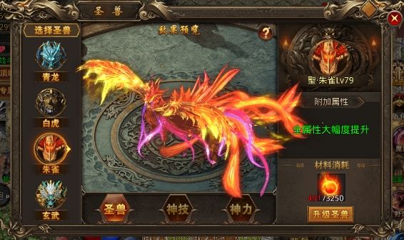 一共四个圣兽,每个圣兽都有两个可提升的附加buff,升级圣兽可大幅度提升全属性