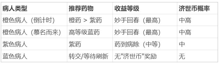 - 紫色/橙色病人:按优先级投喂对应品质药物。