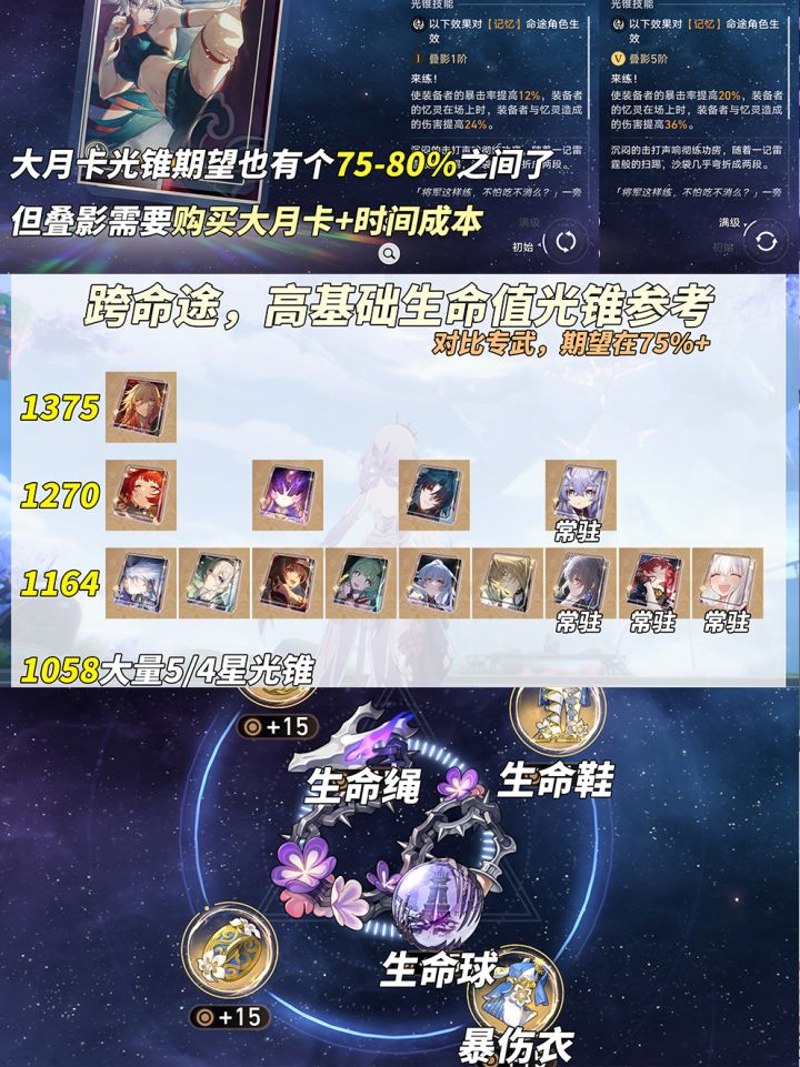 ②跨命途仅为光锥高基础生命值,对比专光期望在75%+。1375基础生命「血火啊,燃烧前路」,1270基础生命「如果时间是一朵花」「她已闭上双眼」「到不了的彼岸」「时节不居」,以及基础生命在1164-1058间的大量5星/4星光锥。