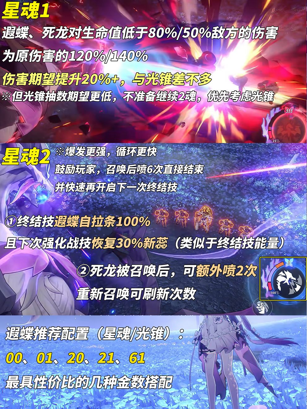 【星魂2】使遐蝶开终结技立即100%自拉条,并且下次施放强化战技直接恢复30%终结技层数,加快循环。而对死龙自身而言,则是在每次被召唤后可额外多喷2次(下次召唤可重置)。对比星魂1综合伤害提升在50%+,2魂可以算是质变星魂了。