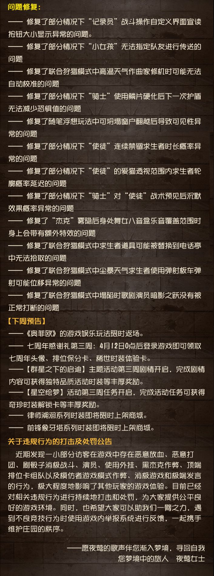 2025年4月3日维护公告: ——七周年感谢礼第二周:登录即可领取周年庆精华x10。 ——第五人格亚运版本(Identity V- Asian Games Version)正式入选2026爱知·名古屋亚运会电子竞技项目,再次感谢大家的支持与陪伴,本周维护结束登录即可领取周年庆精华x10。 ——【赛季精华】:第三十七赛季·精华3正式开放,全新时装更新,包括:【稀世时装】“心理学家”-恒梦、【奇珍时装】歌剧演员-拂晓女士和【奇珍时装】教授-吟游诗人;赛季精华保底数从250个改为200个; ——【商城上新】:病患时装礼包“笼中星”上架商城,内含:【稀世时装】病患-溯光,【奇珍随身物品】病患-记忆囚笼,【头像】病患-溯光;蜡像师时装礼包“旧梦珍匣”限时上架商城,内含:【稀世时装】蜡像师-星相师,【奇珍随身物品】蜡像师-星空球;COAⅦ冠军成都GG战队冠军时装【奇珍时装】破轮 - 破阵子、【奇珍时装】昆虫学者 - 踏莎行限时上架商城; ——【公共地图】:限时公共地图“星夜浮梦”开启; —— 镰田光司联动返场。 更多内容请点击长图了解~ #第五人格维护公告